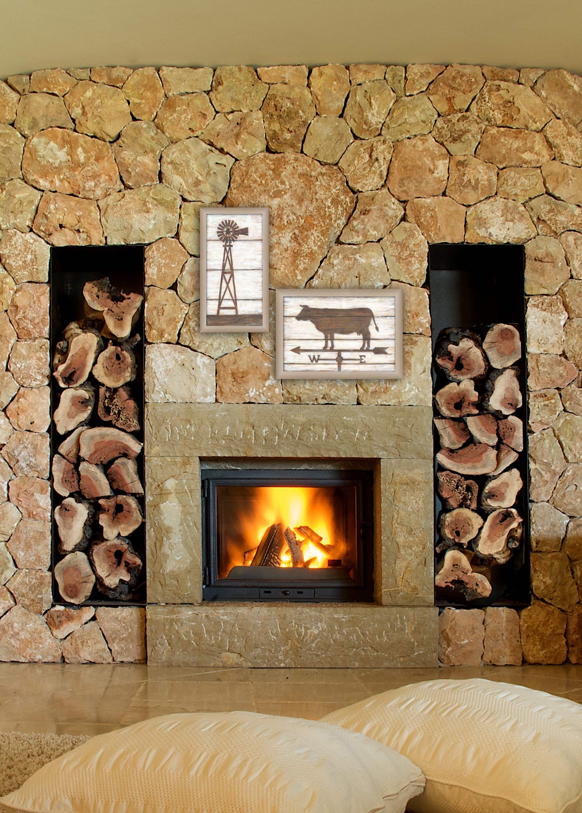 Farmhouse Wind is a set of (2) framed prints including 1- 12" x 21" print of a windmill and 1-21" x 15" of a farm cow weather vane by Annie LaPointe. Framed in a taupe frame. The print has a protective, archival finish (glass is not needed) and arrives ready to hang. Made in the USA with pride by skilled American workers.•Women Owned (WBE)•Textured Artwork with a 'rolled on' acid free acrylic coating to create a canvas painting effect. No glass is necessary.•UV protectant coating protects artwork from fading.•Arrives Ready to Hang