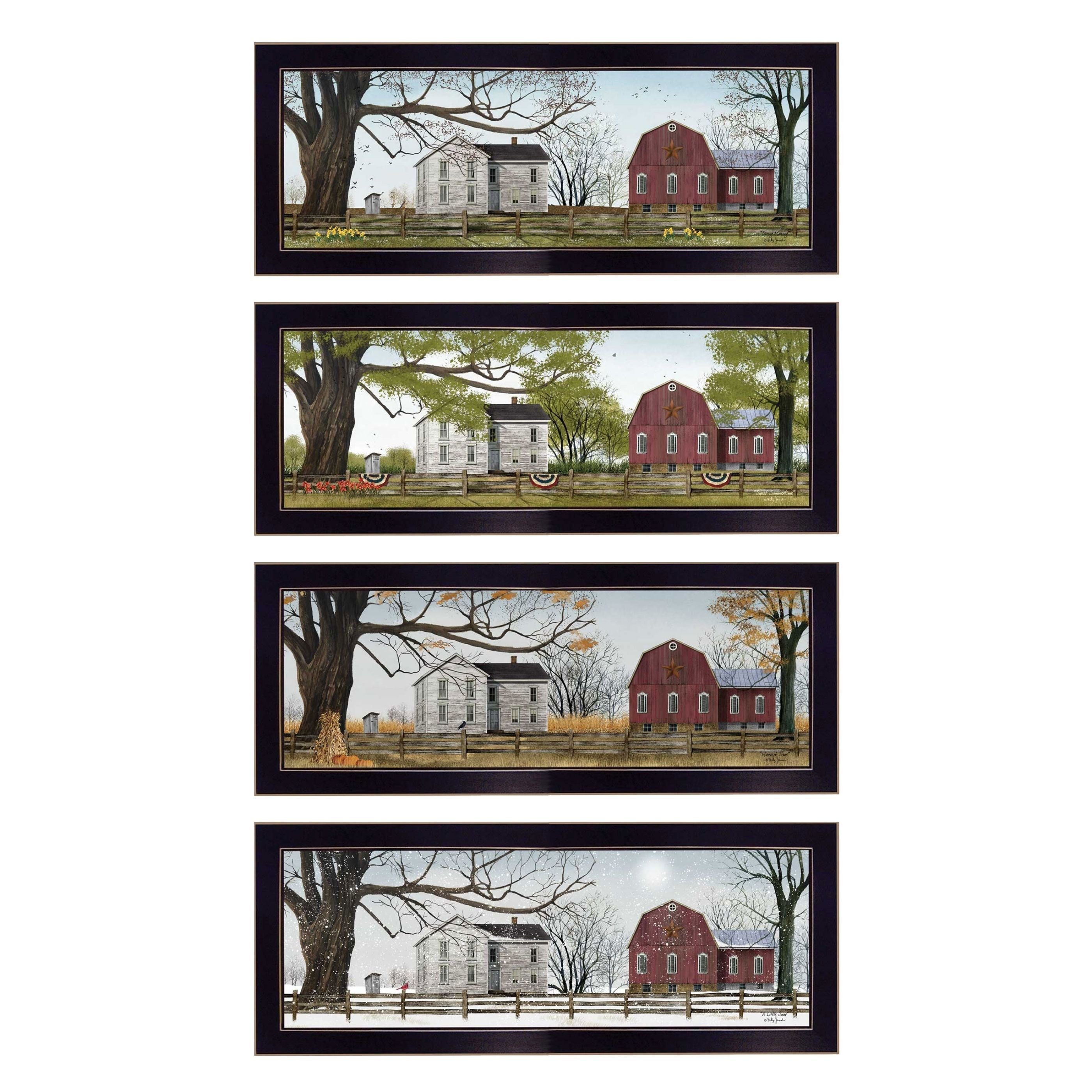 "Four Seasons Collection II" is a set of (4) 20" x 8" framed framed art prints of the art of American artist, Billy Jacobs. Each framed print shows one of the four seasons: Spring, Summer, Fall or Winter. Each shows the same beautiful country home, outhouse, trees, a fence and barn in a different season with seasonal details, such as spring flowers and birds or corn stalks and pumpkins. Crafted by skilled American crafters and coated with a fade-resistant texture, this piece has a canvas-like appearance that will last for years to come. Invest in a piece that is truly one-of-a-kind.•Transform your walls with this stunning piece of art and bring a touch of modern elegance to your room. This stunning piece will not only add visual interest to any room but it's minimalist design will bring a sense of serenity to your space.•Tired of dull, empty walls in your home? We believe that walls should inspire, not bore. That's why we offer a wide range of wall art to suit any space from bedroom and kitchens to office and beyond. Give your walls a facelift with our printed arts and transform your space into a stylish and inviting home.•This framed wall art is hand-crafted in the USA of high-quality wood with the surface of the art coated with a fade-resistant texture which gives it a canvas-like appearance for many years of enjoyment in your home.•Bring a pop of colour and style to any room with our fully assembled and ready-to-hang wall art. With a wide selection of decorative pieces to choose from, you'll easily find the perfect match for your personal taste or to give as a thoughtful gift. Don't miss out on the opportunity to add some unique charm to your space.•Experience the unmatched quality and durability of American-made craftsmanship with this individually hand-crafted wall decoration art. Skilled crafters put their expertise into every piece to ensure it will stand test of time and bless your eyes for years to come.