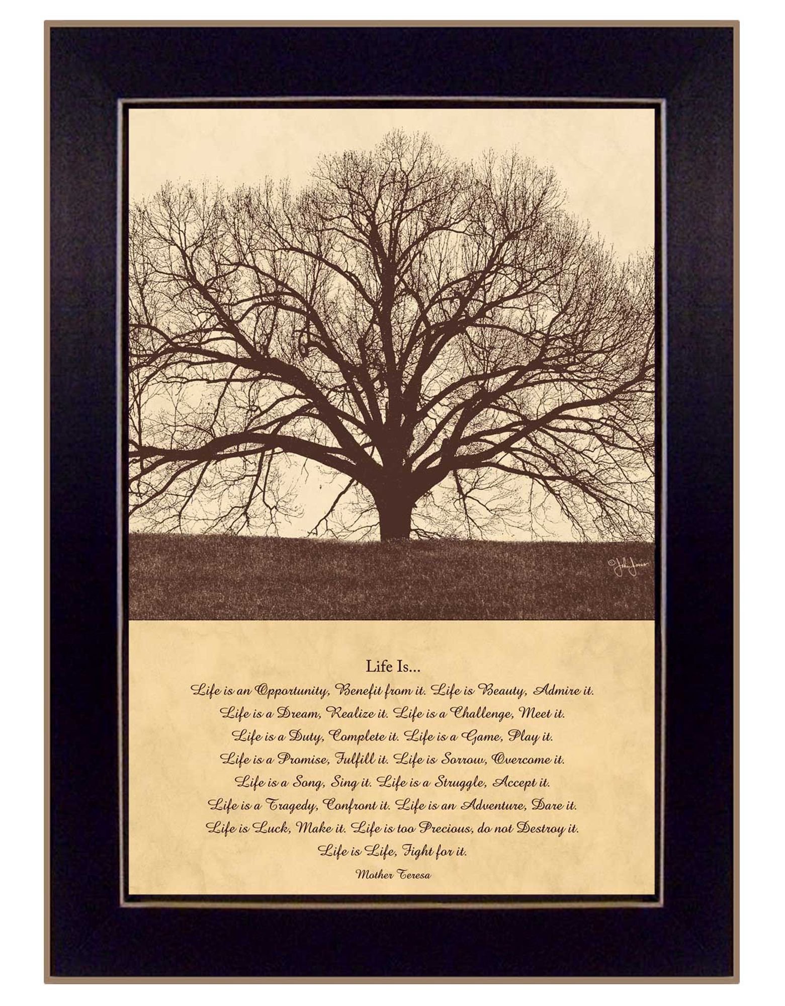 "Life Is" is a 10" x 14" framed inspirational print. This artwork features a prominent image of a Grand Tree on the top half of the presentation. The bottom portion of the piece presents a verse entitled "Life Is" by the exceptional Mother Theresa. Crafted By Skilled American Crafters And Coated With A Fade-resistant Texture, This Piece Has A Canvas-like Appearance That Will Last For Years To Come. Invest In A Piece That Is Truly One-of-a-kind.•Transform your walls with this stunning piece of art and bring a touch of modern elegance to your room. This stunning piece will not only add visual interest to any room but it's minimalist design will bring a sense of serenity to your space.•Tired of dull, empty walls in your home? We believe that walls should inspire, not bore. That's why we offer a wide range of wall art to suit any space from bedroom and kitchens to office and beyond. Give your walls a facelift with our printed arts and transform your space into a stylish and inviting home.•This framed wall art is hand-crafted in the USA of high-quality wood with the surface of the art coated with a fade-resistant texture which gives it a canvas-like appearance for many years of enjoyment in your home.•Bring a pop of colour and style to any room with our fully assembled and ready-to-hang wall art. With a wide selection of decorative pieces to choose from, you'll easily find the perfect match for your personal taste or to give as a thoughtful gift. Don't miss out on the opportunity to add some unique charm to your space.•Experience the unmatched quality and durability of American-made craftsmanship with this individually hand-crafted wall decoration art. Skilled crafters put their expertise into every piece to ensure it will stand test of time and bless your eyes for years to come.